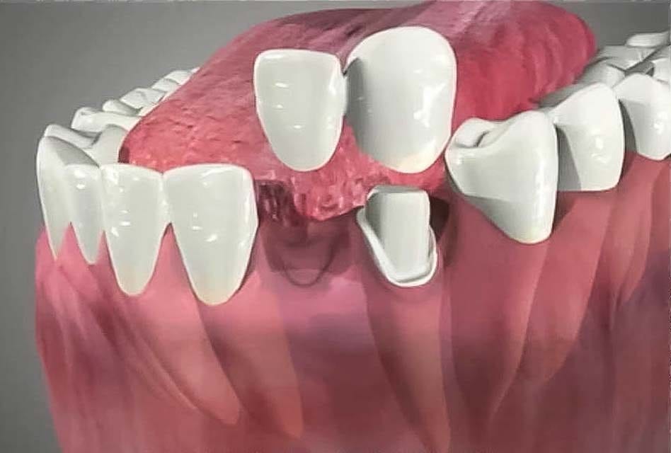 2) پل دندانی پایه (بریج پایه): این نوع پل زمانی استفاده میشود که بیمار از دو دندان مجاور فقط یک دندان را داشته باشد. در این نوع دندانهای متصل به هم در جای دندانهای از دست رفته قرار گرفته و پانتیک به انتهای آنها متصل شده است.