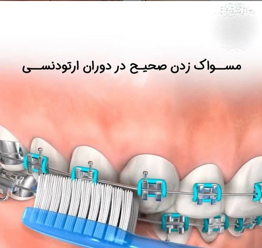 به ناحیههای تماس براکتها با دندانها و بین سیمها توجه بیشتری بکنید، چون گیر غذایی این نقاط بسیار بالا است.