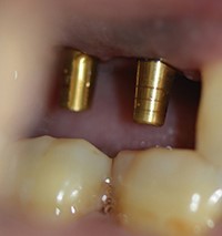 پس از 3 هفته بیمار برای ارزیابی و تاثیرات نهایی به کلینیک برگشت. تاج های موقت برداشته شدند و پیکاپ قالب های انقباض بافت (TRIPs) در محل قرار گرفت (شکل 16). قالب نهایی با استفاده از ترکیبی از مواد قالب گیری وینیل پلی سیلوکزان سنگین و سبک (Identium [Kettenbach LP]) (شکل 17) گرفته شد. هنگامی که این قالب ها از دهان خارج شدند، آنالوگهای تک بخشی ایمپلنت دوباره در TRIPs قرار می گیرند. قالب های چهارگوش بالا و پایین (Futar [Kettenbach LP]) برای ساخت ترمیمهای PFM فردی به آزمایشگاه فرستاده شد (شکل 18). تاج های موقت برداشته شدند و سپس بیمار مرخص شد.