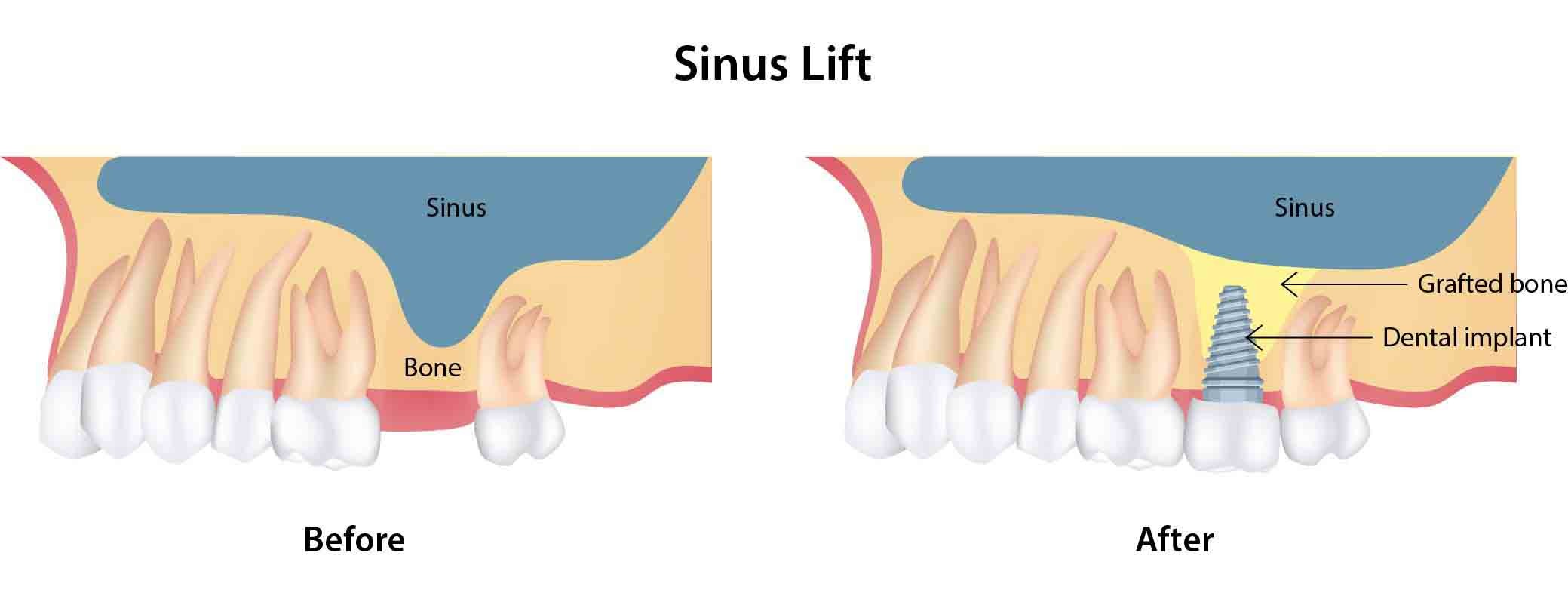 معمولاً پس از کشیدن دندانهای آسیای پوسیده و عفونتی استخوان فک بالا که به مجرای تنفسی بینی متصل است به مقدار زیادی تحلیل میرود به همین دلیل نبود استخوان برای گذاشتن ایمپلنت مشکل ایجاد میکند در نتیجه به ایجاد استخوان برای گذاشتن ایمپلنت نیاز است.