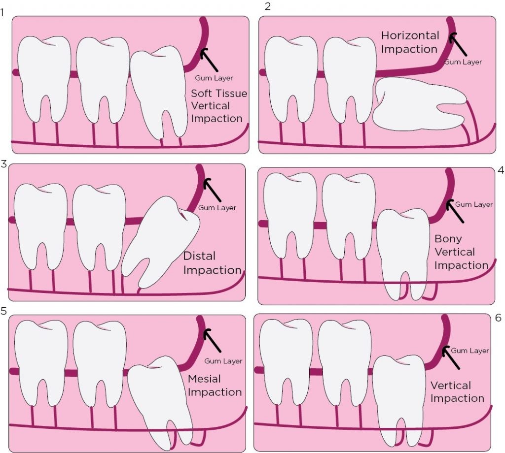 عموما سه نوع دندان عقل داریم: دندان عقلی که به صورت کامل روییده است، دندان عقل نیمه نهفته و نهفته که زمانی به صورت نهفته و نیمه نهفته رشد میکند که استخوان فک فضای کافی برای رویش آن نداشته باشد.